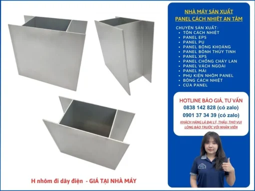 - Panel cách nhiệt An Tâm cung cấp loại nhôm chống bám bụi, có tính thẩm mỹ tốt, bảo đảm độ bền chắc cho công trình. Thanh H đi dây được tạo hình chuẩn xác theo khuôn định sẵn, kiểm soát chặt chẽ chất lượng đầu ra. Với đặc tính nhẹ, phụ kiện giúp giảm đáng kể chi phí thi công, vận chuyển cũng như rút ngắn thời gian lắp đặt.